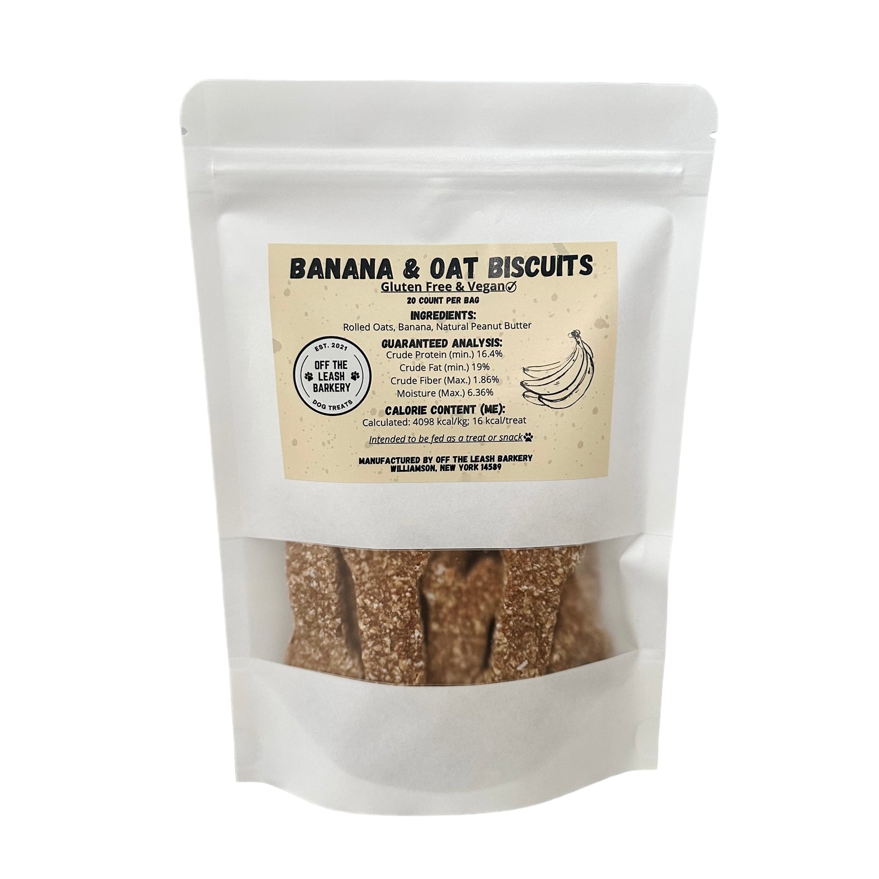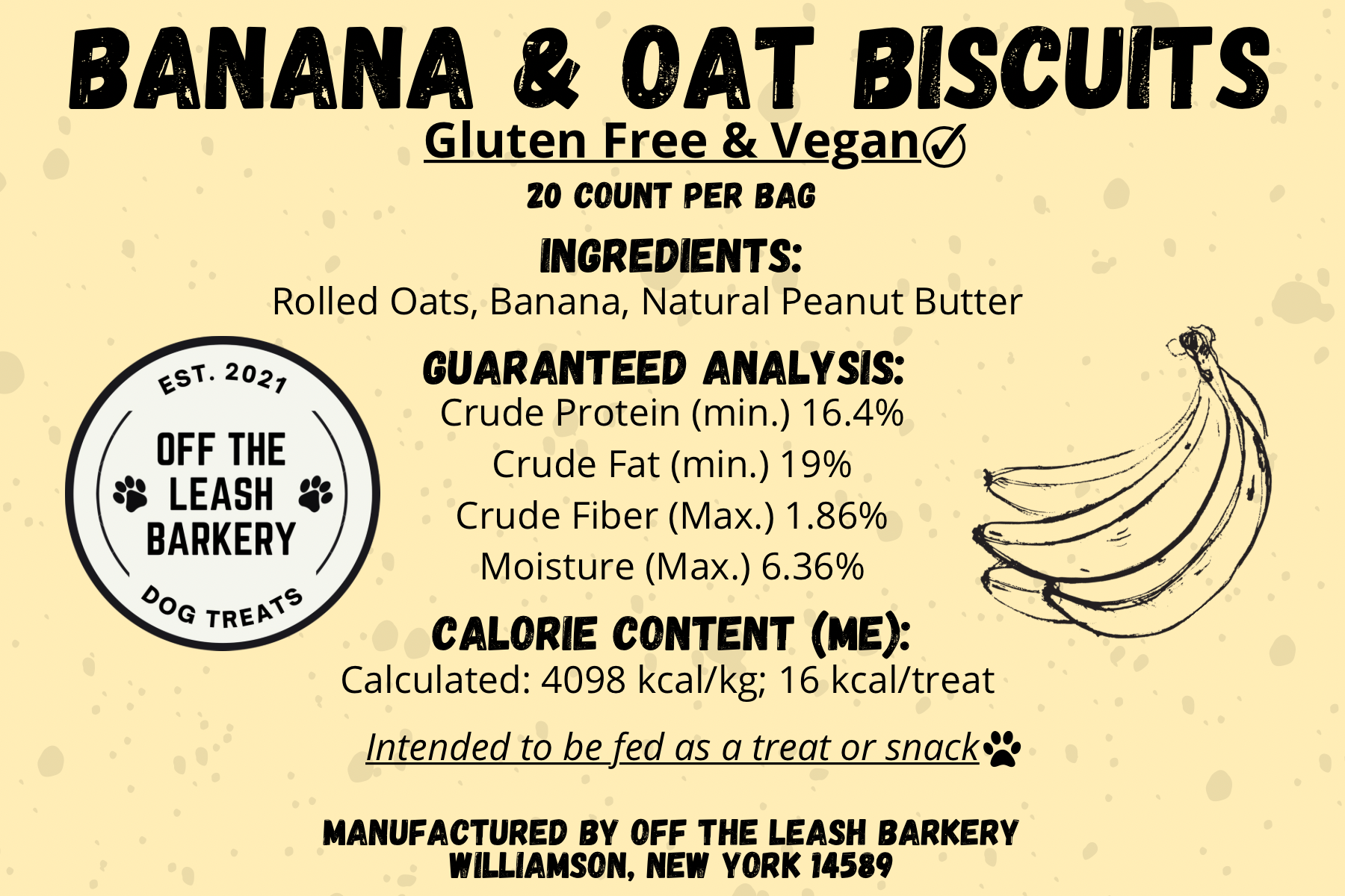 Our Banana & Oat Biscuits are made with three natural ingredients to ensure your dog is getting a healthier treat. Shelf life is 5 months at room temperature when stored in our packaging away from direct sunlight.